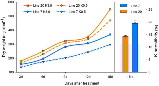 As shown in Figure 1, dry matter accumulation increased dramatically from 3 to 15 days at low K stress. Dry matter accumulation of K high-efficiency type (Line 20) was significantly higher than that of K low-efficiency type (Line 7) under both low K (LK) and normal K (CK) conditions, though low K treatment significantly decreased the dry matter accumulation in two genotypes with less affected in Line 20 than Line 7. Additionally, K sensitivity of Line 20 was significantly lower than Line 7 (Figure 1).