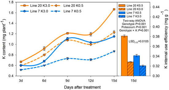 The K accumulation in two genotypes also showed an increasing trend from 3 to 15 days after treatment (Figure 2). Compared with Line 7, Line 20 had a higher K content under both LK and CK conditions. At 15 d after treatment, the K accumulation with low K treatment reached 1.23 g plant−1 in Line 20, but only 0.87 g plant−1 in Line 7. At the same time, LK stress enhanced the K internal use efficiency (KIUE) of the two genotypes with 11.7% increase in Line 20 (Figure 2).