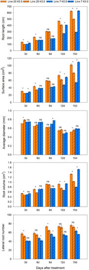 The morphological characteristics of the root system are important indicators of plant potassium uptake. In the present study, with seedlings growth, low K stress generally increased the total root length, surface area, and root volume in Line 20, but decreased those parameters in Line 7 (Figure 3). For instance, low K stress increased the total root length by 25.3% in Line 20 but decreased the total root length by 53.5% in Line 7 at 15 d after treatment. From 3 to 15 d after treatment under low K (LK) and normal K (CK) concentrations, the total root length increased by 3.6 (492 cm) and 4.0 times (401 cm) in Line 20, and by 2.9 (191 cm) and 5.2 (510 cm) times in Line 7 respectively. More lateral roots (LRs) were found in Line 20 compared with Line 7 under both K concentrations. Under the LK and CK treatment, LR of Line 20 was 30.6% and 28.3% higher than that of Line 7, respectively.