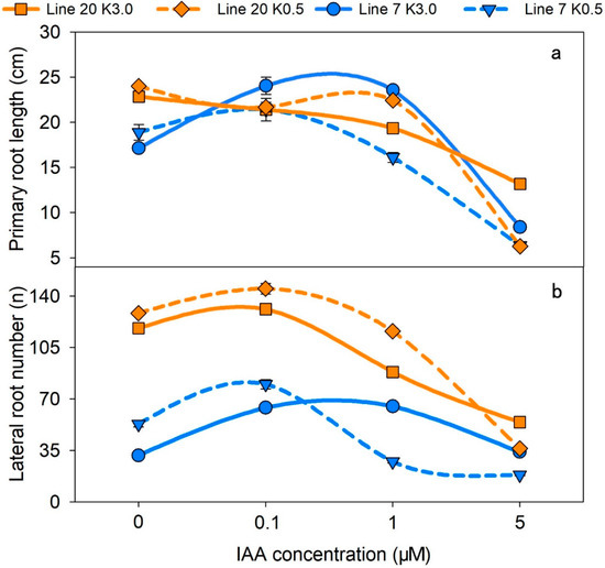 To verify the effect of auxin signal transduction to root formation, we designed an exogenous auxin application experiment. The primary root length of HKE and LKE genotypes demonstrated different patterns in response to exogenous IAA application (Figure 4a). The exogenous IAA application at low K stress inhibited primary root elongation in LKE genotype, but not in HKE genotype. As shown in Figure 4b, low concentration of exogenous IAA (0.1 μM) application induced more lateral root formation in both HKE and LKE genotypes under two K conditions. Under the LK condition with 0.1 μM exogenous IAA, 145 lateral roots were found in Line 20, which was significantly higher than that of Line 7 (p < 0.05). With the increase in exogenous IAA concentration, lateral root number decreased dramatically. In HKE genotype, low K stress generally increased lateral root number up to 1 μM exogenous IAA. While in LKE genotype, more lateral roots were found in the normal K condition when exogenous IAA concentration was higher than 1 μM.