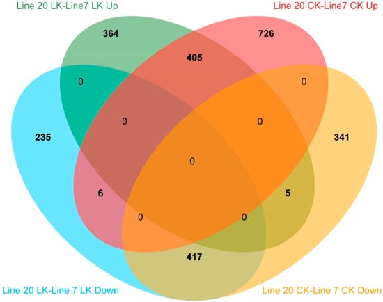 By comparing transcriptome libraries between K high-efficiency genotype Line 20 and K low-efficiency genotype Line 7, under low K stress and normal K concentration conditions, differentially expressed genes (DEGs) were identified using the combined criteria of p-adjust < 0.05 and |log2FC| ≥ 1. Using these standards, 1432 (774 up-regulated and 658 down-regulated) and 1900 (1137 up-regulated and 763 down-regulated) genes were differentially expressed in low K (LK) and normal K (CK) conditions, respectively (Figure 5). Among them, 405 genes were co-up-regulated and 417 were co-down-regulated in both conditions. A total of 364 and 235 genes were specific up- and down-regulated under the LK condition and 726 and 341 genes were specific up- and down-regulated under the CK condition. Meanwhile, 11 inverse regulated genes were identified between LK and CK conditions. These results were then further analyzed.