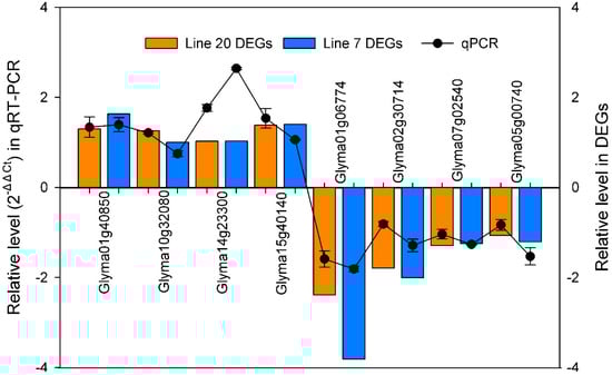 Changes in gene transcription are associated with changes in the expression of transcription factors (TFs). Transcriptional control of the expression of stress-response genes is a crucial part of the plant response to a range of abiotic and biotic stresses [44]. Transcription factors can show some complexity and overlap in their responses to different stressors and are likely to lead to new ways of enhancing crop tolerance to environmental stress [23], including low K stress [26]. In this study, a total of 82 DEGs belonging to 22 transcription factor families were identified for the two K-efficiency types under low K stress, and the major transcription factor families were bHLH (13), NAC (9), bZIP (9), AP2/ERF (6), WRKY (6), MYB-related (6) and MYB (6) (Table S9). These TF families were reported to play a vital role in the transcriptional regulation of plants [45]. For instance, AKSs, the basic helix–loop–helix (bHLH) transcription factors in guard cells of Arabidopsis, facilitated stomatal opening through the transcription of genes encoding inwardly rectifying K+ channels in their unphosphorylated state. In soybean, two bHLH transcription factors, GmbHLH57 and GmbHLH300, were identified in response to Fe-deficiency, both of which were expressed in roots and nodules [46]. Our results also identified a GmbHLH300 homologous gene (Glyma03g28630) higher expressed (2.80 log2FC) in the HKE genotype. We assume that GmbHLH300 might also be involved in K high-efficiency uptake in vegetable soybean. Many NACtype genes have been found to play roles in shoot apical meristem formation, organ separation and stress tolerance [47,48,49]. Meng et al. (2007) cloned and initially characterized six NAC-like genes in soybean for the first time, but did not verify its function [50]. Hao et al. (2011) indicated that overexpression of soybean GmNAC20 enhances salt and freezing tolerance and also promotes lateral root formation in transgenic Arabidopsis plants [49]. In this study, we identified nine differentially expressed NACs which may modify and regulate genes that affect potassium efficiency. Wang et al. (2012) also identified some AP2/ERF, WRKY and MYB family transcription factors differentially expressed in low K-resistance in soybeans [26]. The differentially expressed TFs identified in our results are useful in discovering candidate genes related to K stress tolerance.
