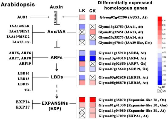 Plant hormones play important roles in the regulation of root architecture formation [59,60,61]. According to the KEGG enrichment results under the LK condition, DEGs were significantly enriched in the “Plant hormone signal transduction” pathway In the present study. Among them, most genes were enriched in auxin signal transduction. Auxin has been widely reported as the main positive regulator, which regulates all stages of lateral root formation [21,58,62,63]. The present study also demonstrated the specific role of auxin in lateral root development of vegetable soybean. In Arabidopsis, periodic gene activities in the oscillation zone (covers the basal meristem and elongation zone) are at least partially correlated with auxin signaling, constituting an early step in positioning new LRs. This process relies on the AUX1 gene expression, which encodes an auxin influx carrier member that facilitates auxin transport [64]. The auxin signal captured by TIR1/AFBs accelerated the degradation of Aux/IAA proteins, typified by IAA14/SLR, IAA3/SHY2, IAA19/MSG2, and IAA28, thereby derepressing the function of ARF7 and ARF19 as transcriptional activators [65]. ARF7 and ARF19 activated the transcription of downstream target LBD genes, including LBD16, LBD18, and LBD29 [21]. LBDs also probably regulated lateral root formation by activating the down-stream EXPANSIN genes expression [20,63].