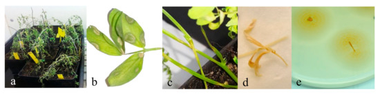 Damage produced by C. lentis race 0 on the susceptible check (S12) by 120 hpi: (a) whole plant’s appearance; (b) damages on leaves; (c) damages on stems; (d) infested leaf dried in flow chamber; (e) PDA + CLF Petri dish with fungus developed from infected leaf segment (upper part) and stem (lower part).