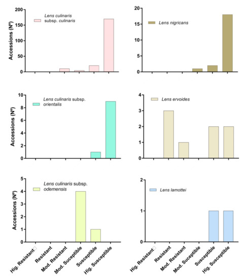Resistance was more frequent in L. ervoides, with three accessions out of eight that rated as R (PI572330, PI572334 and PI572338) and one as MR (PI572327) (Figure 2). Resistant accessions of L. ervoides showed very limited and superficial damages at both the stem and foliar level, leading to values of plant mortality ranging between 0–9%. Resistance response of accession PI572330 was in line with previous reports by Tullu et al. [15]. On the contrary, resistance was not identified in L. culinaris subsp. orientalis, L. culinaris subsp. odemensis, L. lamottei nor in L. nigricans, in which all studied accessions were rated as HS, S or MS (Table S1; Figure 2), in agreement with previous findings [13,15].