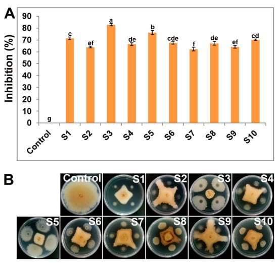 Antifungal assay of rhizospheric soil bacteria of sweet potato fields against P. versicolor XJ27. (A) Inhibitory effects of ten isolates of rhizospheric soil bacteria on the mycelial growth of P. versicolor XJ27 relative to control. (B) Dual culture assay on potato dextrose agar (PDA) plate with antagonistic bacteria and P. versicolor XJ27. For the control, the fungus was inoculated at the center and LB broth was point-inoculated instead of antagonistic bacteria. Inhibition (%) was calculated in comparison to control. Values are means ± SE of four replications for each treatment. Similar letters are not different at p ≤ 0.05.