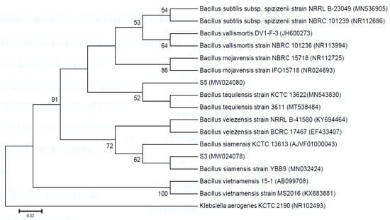 Ten rhizospheric isolates with antifungal activity were subjected to identification by 16S rRNA analysis. Homology analyses were done by submitting nucleotide sequences derived from PCR-amplified 16S rRNA fragments to the EzBioCloud database service (www.ezbiocloud.net). The sequences of eight isolates (S1, S4, S5, S6, S7, S8, S9, and S10) had up to 99.9% homology with B. tequilensis, and two isolates (S2 andS3) had up to 99.9% homology with B. siamensis. The accession numbers from MW024076 to MW024085 were obtained by submitting the 16S rRNA gene sequences to NCBI GenBank. A brief description is given in Table S1 for all identified isolates. The phylogenetic tree was constructed using the 16S rRNA sequences, which showed that S3 was in the group of B. siamensis and S5 was in the group of B. tequilensis (Figure 2).