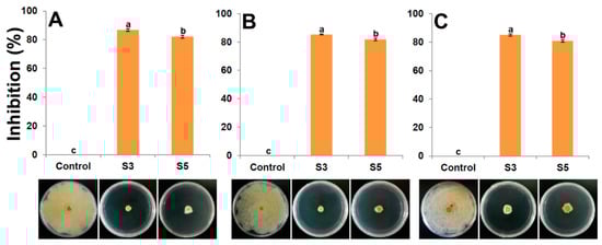 Antifungal action of extracellular culture filtrates. (A) Inhibition by normal extracellular culture filtrate. (B) Inhibition by autoclaved extracellular culture filtrate. (C) Inhibition by extracellular culture filtrate stored at 4 °C for 72 h. For the control, sterilized LB media was added with PDA instead of extracellular culture filtrates. Data are mean value ± SE of three replications for each treatment. The same letters are not significantly different at p ≤ 0.05.