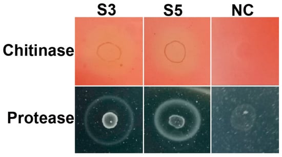 The hydrolytic enzymes activity assay results indicated that both S3 and S5 can produce chitinase and protease (Figure 5). Both strains did not show β-1, 3-Glucanase activity.