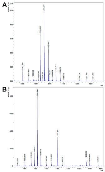 Lipopeptides detection through MALDI–TOF mass spectrometry analysis. (A) Mass spectra obtained from S3; (B) mass spectra obtained from S5.