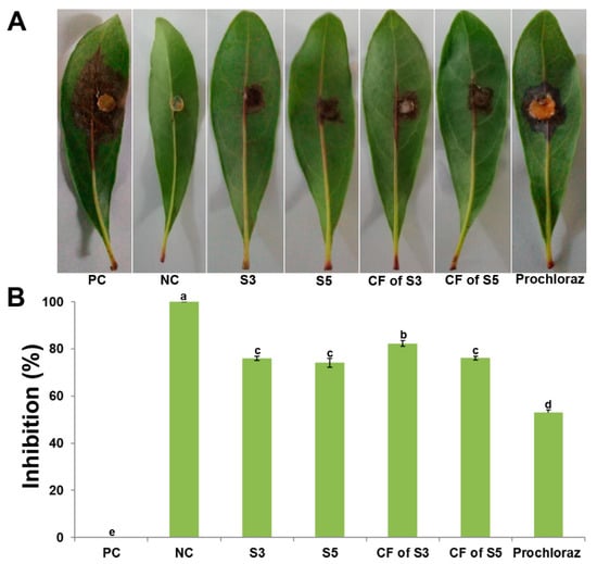 Following the satisfactory fungal inhibition by antagonistic bacteria and their extracellular culture filtrates, inhibition against P. versicolor XJ27 was observed on bayberry leaves (Figure 7). The detached leaf assay results showed that S3 and S5 inhibited leaf lesion by 76.1% and 74.2%, respectively. The extracellular culture filtrates of S3 and S5 inhibited leaf lesion by 82.3% and 76.2%, respectively. Prochloraz inhibited 53.1% of lesions. This result suggests that these antagonistic bacteria can be used as an environmentally safe alternative to fungicides.