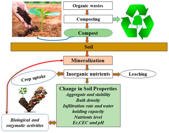 - The breakdown of soil aggregates as a result of soil colloid breakdown in the case of high concentrations of cations like Na+ and K+ [212]. Additionally, other contaminants like persistent organic pollutants (POPs) and potentially toxic elements, among others, could be released from some types of composts [207,213].
