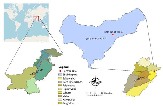 The experimental site was located at the Rice Research Institute (31°72′ N, 74°28′ E, slope 1.8%), Kala Shah Kaku (RRI, KSK), Shiekhupura, Punjab, Pakistan (Figure 1), and has sub-humid, subtropical climate. The average annual precipitation for the study period (2014–2018) was 585 mm, and 70–80% (409–468 mm) of the precipitation was recorded during summer (June–August) while winter received gentle rainfall of around 35–40 mm. The annual mean maximum temperature ranged from 36 to 42 °C with extremes of 48 °C during summers and a minimum of 4–6 °C during winter for the same period. From May to September, the relative humidity ranged 35–70%, whereas from January to May, the annual light period varied from 5.1 to 10.4 h. The reference evapotranspiration (ET0) was higher (6.4 mm) in May and minimum (1.1 mm) in December. Soil in the area is classified as Bahalike series loam (a village in central Punjab). However, according to the Food and Agriculture Organization (FAO) classification system, it is classified as Haplic Yermosols (FAO, 2014) [33] and in the United States Department of Agriculture (USDA) classification system it is classified as hyperthermic Ustalfic Haplargid [34]. Wheat and rice are the important cereals of the area. Generally, wheat is rotated with summer rice. The wheat crop is cultivated in between 24–28 November and harvested at the end of April (25 April to 10 May), while rice was transplanted at the end of July (25–30 July) and harvested in mid-November (15–20 November) during all the experimental year.