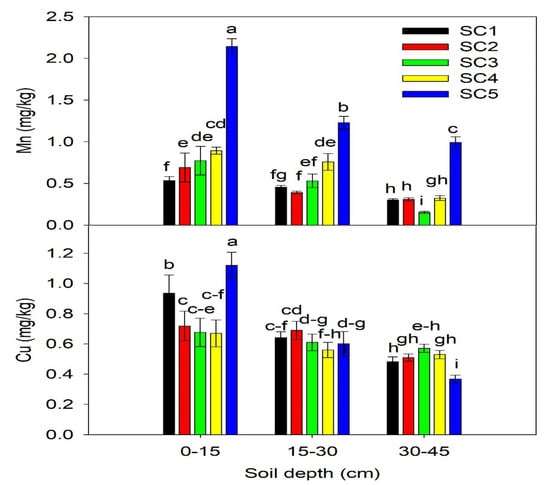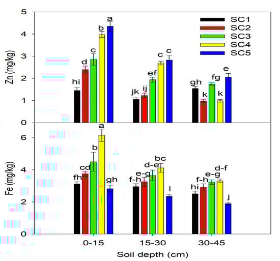 The data presented in Figure 2 and Figure 3 indicated that DTPA-extractable Cu, Mn, and Zn concentration remained significantly higher under SC5 than SC1 at 0 to 15 cm soil depth. The higher Cu, Mn, and Fe concentration might be attributed due to more accumulation of organic matter on the upper surface [47]. The interaction of Cu, Mn, and Zn with soil organic matter resulted in poor soil mixing under low pH, which decreased the Cu, Mn, and Zn availability in the subsoil [72,73]. Similarly, de Santiago et al. [74] reported more Cu, Mn, and Zn concentration under conservation tillage, which is associated with higher SOM and higher microbial activity under less soil disturbance than that of conventional tillage at 0 to 5 cm soil-depth after 21 years of the long term experiment. In the present study, more residues were left in the SC5 scenario with least soil disturbance resulting from higher Cu, Mn, and Zn availability on the top surface and it decreased with an increase in soil depth, which restricts the movement in the soil due to complexation of Cu, Mn, and Zn with the chelated agents [75]. The Fe (Figure 3) was significantly higher in residue returning practices (SC4) than other scenarios while conservation tillage showed minimum concentration of Fe (Figure 3), probably due to conditions that favor more available Fe2+ than Fe3+ fractions [47]. Whereas, some earlier work found no significant changes under long term conservation tillage practices [73,74].