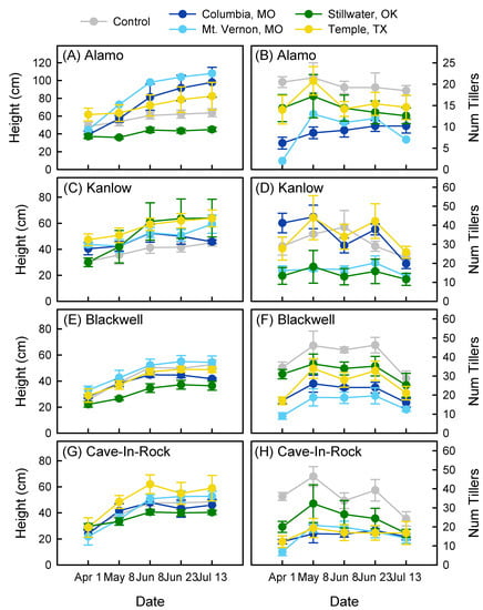 Height (left) and number of tillers (right) for switchgrass cultivars (A–H) and soil inoculum sources (colors) across five dates from April to July 2015. Note the different scales for Alamo (A,B) compared to all other ecotypes (C–H). Points are means ± SE (n = 4–5).