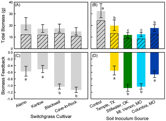 Total biomass (A,B) and biomass feedback (C,D) as a function of switchgrass cultivar (A,C) and soil inoculum source (B,D). Hatches show the portion of total biomass in roots. Bars are means ±95% CI (biomass) or 1 SE (feedback) with n = 22–24 for cultivar and n = 17–20 for soil inoculum source. Letters indicate significant differences in posthoc comparisons.
