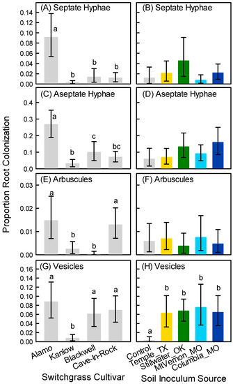 Root colonization by septate hyphae (A,B), aseptate hyphae (C,D), arbuscules (E,F), and vesicles (G,H) as a function of switchgrass cultivar (left) and soil inoculum source (right). Bars are means ±95% CI (cultivar n = 22–24; soil source n = 17–20). Letters indicate significant differences in posthoc comparisons.