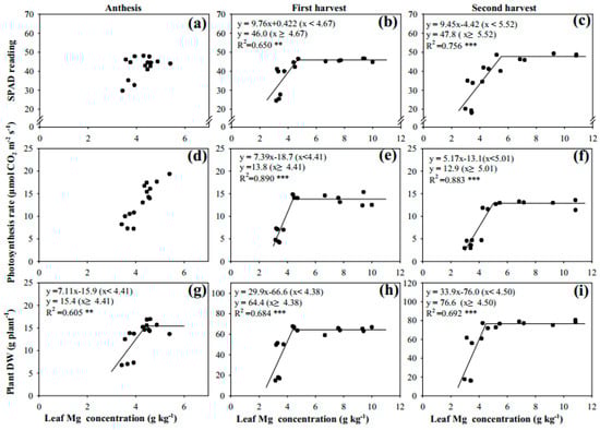 A linear-with-plateau model produced the best fit for the relationships between SPAD reading and photosynthesis rate against leaf Mg concentration at the first and second harvest; however, the model did not fit at the anthesis stage (Figure 1a–f). As indicated by the plateau, SPAD readings and photosynthetic rates were highest at leaf Mg concentrations of 4.67 and 4.41 g·kg−1 at first harvest and 5.52 and 5.01 g·kg−1 at second harvest (Figure 1a–f). Mg nutrition improved plant DW both at anthesis and at the first and second harvest, and it increased to 15.4 g·plant−1, 64.4 g·plant−1, and 76.6 g·plant−1 in these three growth stages before plateauing (Figure 1g–i). The critical leaf Mg concentration for high plant DW was about 4.41, 4.38, and 4.50 g·kg−1 at these three growth stages, which was lower than that for the high SPAD reading and photosynthetic rate (Figure 1a–i).