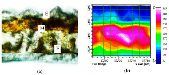Chemical composition area maps of part of a transverse leaf section from a rubber tree, which was achieved using Fourier transform infrared (FTIR) microspectroscopy point to point mapping with aperture setting at 15 × 15 µm steps. (a) A micrograph of a rubber tree plantation. (b) Integrated mapping of chemical composition, obtained over the spectral region of 4000–900 cm−1. E, Epidermis; M, Mesophyll.
