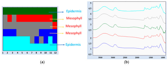 Fourier transform infrared (FTIR) mapping of rubber tree plantation. Hierarchical cluster analysis (HCA) was performed to determine the separation of spectral groups according to the composition within rubber leaf tissues. (a) The map consists of mesophyll layers (red, gray, blue) and epidermis layers (green and light blue). (b) 2D HCA mapping was produced using 2 clusters in the range of 4000–900 cm−1.