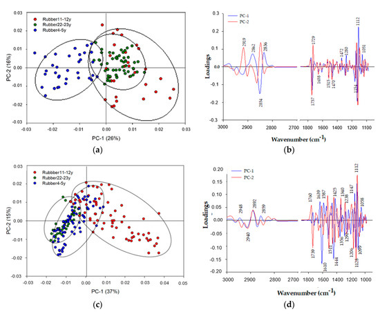 Principal component analysis (PCA) analyses of rubber tree leaves: (a,b) Score and loading plots derived from the PCA analyses of epidermis groups; (c,d) score and loading plots derived from the PCA analyses of the mesophyll.