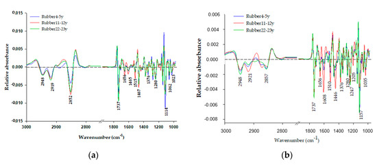 An overlay of second-derivative average spectra from differently aged rubber tree plantations: (a) Epidermis and (b) mesophyll. The average second derivative spectra were calculated after 13 points of smoothing and normalization, with extended multiplicative signal correlation over the spectral ranges of 3000–2800 and 1800–900 cm−1.