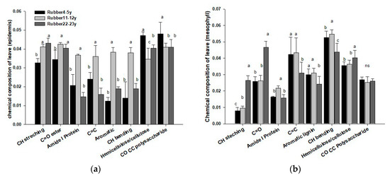 The integral area of average spectra in the (a) epidermis and (b) mesophyll of rubber tree plants from differently aged plantations. Data followed by the different letters (a, b, and c) are significantly different at p < 0.05. ns: not significantly different.