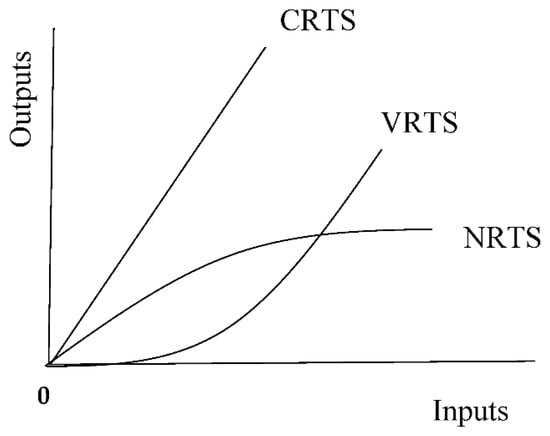 The DEA can be formulated on the basis of constant returns to scale (CRTS), variable returns to scale (VRTS) or non-increasing returns to scale (NRTS). CRTS is based on Charnes et al. [39]. It assumes that a proportional change in inputs should produce an equal proportional change in inputs. VRTS and NRTS are based on Banker et al. [42]. VRTS assume that a proportional change in inputs can produce an equal or larger proportional change in outputs. NRTS assume that a proportional change in inputs produces a smaller proportional change in outputs. Incorporating economies of scale in the analysis allows us to see how farmers who are considered efficient may gain, lose or maintain a constant level of productivity. Figure 1 illustrates these concepts graphically.