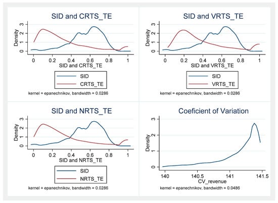 Our results indicate that the average crop diversification index among rural farmers in Zambia is 0.49. Figure 2 shows kernel plots for crop diversification as measured by the SID index and technical efficiency assuming constant returns to scale (CRTS), variable returns to scale (VRTS) and non-increasing returns to scale (NRTS). The figure also shows a kernel plot for the coefficient of crop income variation. These plots suggest that crop diversification and technical efficiency have a negative relationship.