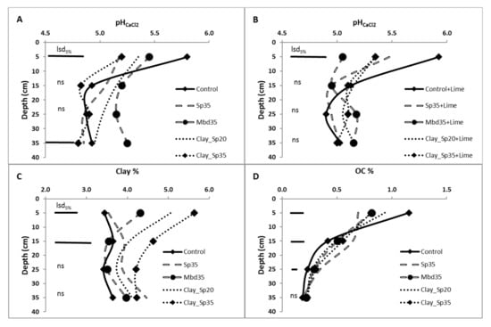 The Clay_Sp20 and Clay_Sp35 treatments had lower Ca levels than the Control in three of the six years (Table 6). Despite this, the values of Ca were above the critical deficiency (0.25%) levels [] in all treatments.