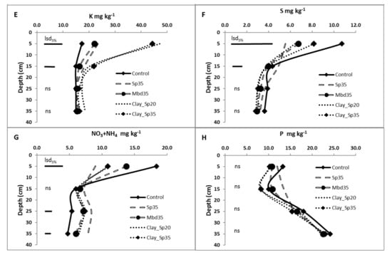 The Control treatment had higher pHCaCl2, OC%, S and mineral nitrogen (NO3- + NH4+) in the 0–0.1 m layer than the Mbd35 and Sp35 treatments (Figure 2A,B,D,F,G). At lower depths in the soil profile, the Control had lower pHCaCl2, OC% and NO3+ NH4+ than the Mbd35 treatment and similar values to the Sp35 (Figure 2D,G). Clay content and K were increased to more than 5.2% and 44 mg kg−1 to a depth of 0.1 m respectively within the Clay_Sp20 and Clay_Sp35 treatments compared to less than 3.5% and 20 mg K kg−1 for the Control and Mbd35 treatments (Figure 2C,E). Below 0.1 m depth there were no significant differences in clay content between the treatments (Figure 2C). At depths greater than 0.2 m there were no differences in K among treatments. The Colwell-extractable P was not affected by the tillage and clay treatments at any depth measured (Figure 2H).