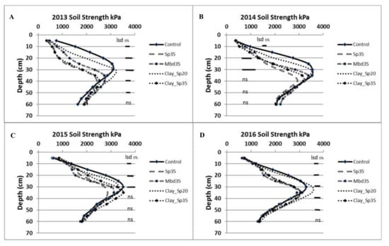 Soil strength as affected by the control, spaded (±clay) (Sp35) and mouldboard ploughed (Mbd) treatments. Measurements recorded during the winter months of 2013 (A), 2014 (B), 2015 (C) and 2016 (D). Treatment abbreviations are listed in Table 2. Horizontal bars represent the LSD (p ≤ 0.05) for the corresponding depth; ns- not significant (p = 0.05).