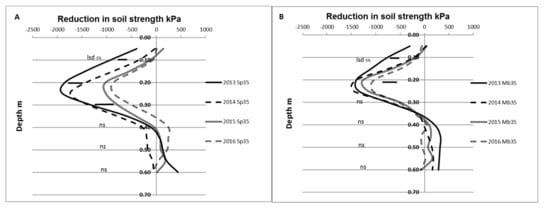 Reduction in soil strength between the Control and the treatment spaded to 35 cm depth (Sp35) (A) and between the Control and the treatment mouldboard ploughed to 35 cm depth (Mbd35) (B) to 60 cm depth for each year (2013–2016). Positive values occur where soil strength for the Sp35 and Mbd35 treatments exceed that of the Control. Horizontal bars represent the LSD (p ≤ 0.05) for the corresponding depth; ns- not significant (p ≤ 0.05).