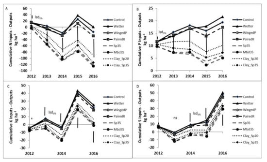 Treatment effects on cumulative nutrient balances (kg/ha) for Nitrogen (A), Phosphorus (B), Potassium (C) and Sulfur (D) for the years 2012 to 2016. Vertical bars represent the LSD (p ≤ 0.05) for the corresponding year; ns is not significant (p > 0.05). Note K fertiliser was only added in 2012 and 2015. Treatment abbreviations are listed in Table 2.