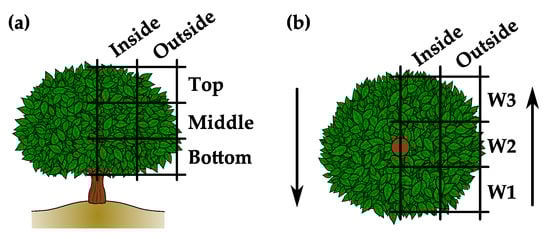 Sections of the canopy considered for average leaf area density (LADt) estimation. (a) Side view across the row and (b) top view of a standard citrus tree. Arrows indicate the forward direction of the sprayer.