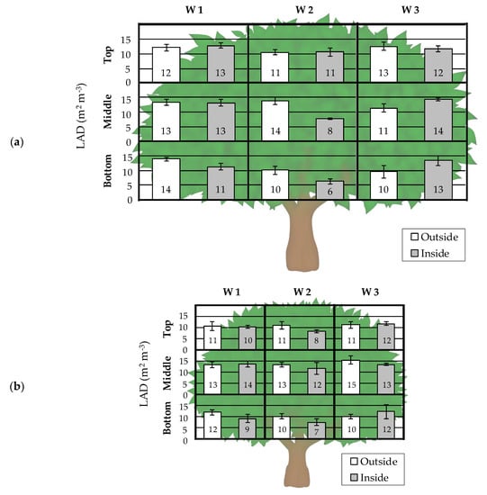 The highest LAD of the canopy was found in the outer part and middle height, while the lowest LAD was found in the interior area of Width 2, that is to say, the central zone of the canopy, especially at the bottom, both in the adult plot and in the young plot (Figure 3). The mean LAD of the adult plot was 11.61 ± 0.52 m2 of leaves m−3 of canopy and that of the young plot was 11.42 ± 0.48 m2 of leaves m−3 of canopy.