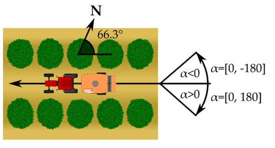 Criterion followed to determine wind direction with respect to tree rows. ‘N’ means geographic north. Angle α refers to the angle used to express the wind direction in the treatments.
