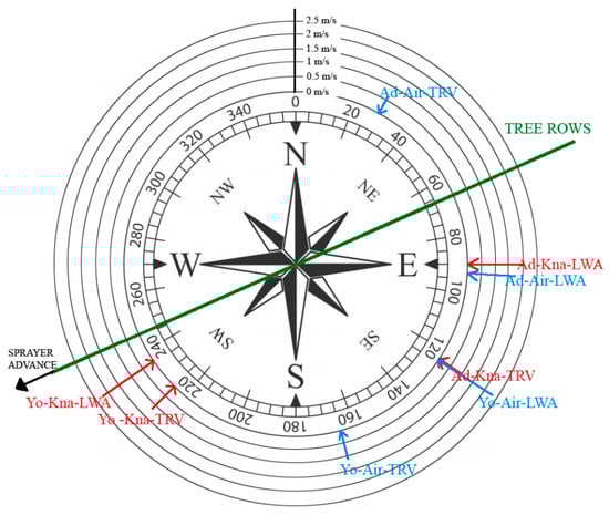 It is important to highlight that all the applications were performed under appropriate temperature and relative humidity conditions, and with an average wind speed lower than 3 m s−1, which is the maximum established in the Spanish legislation to minimize drift-associated risks []. Regarding average wind direction, in only one treatment, Ad-Air-TRV, wind came from the right side of the sprayer; meanwhile, in all the other cases, wind came mainly from the left side. On the other hand, in the treatments applied with the knapsack sprayer in the young plot, based on both TRV and LWA, wind came almost parallel to the tree rows, while in the others, its direction was more transversal (Figure 5).
