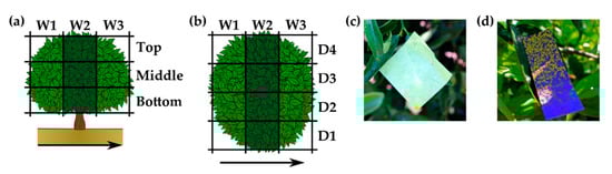 Quadrants of the canopy where the collectors were placed (shaded): (a) side view along the row and (b) top view. The arrows indicate the direction of the sprayer. Collectors used: (c) filter paper to estimate leaf deposition and (d) water-sensitive paper (WSP) to estimate spray coverage.