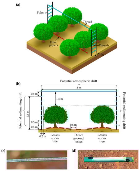 Collectors of off-target losses: (a) perspective and (b) side view across the row of the young plot with the structure provided by the collectors to estimate the potential drift and losses to the ground. The potential-drift-collecting threads are shown in light blue, and the ground-loss-collecting filter papers are shown in red. Collectors used: (c) nylon thread to estimate the potential drift and (d) filter paper to estimate ground losses.