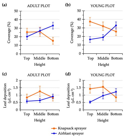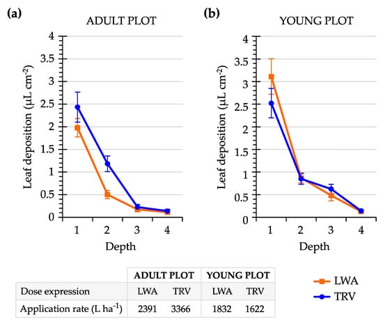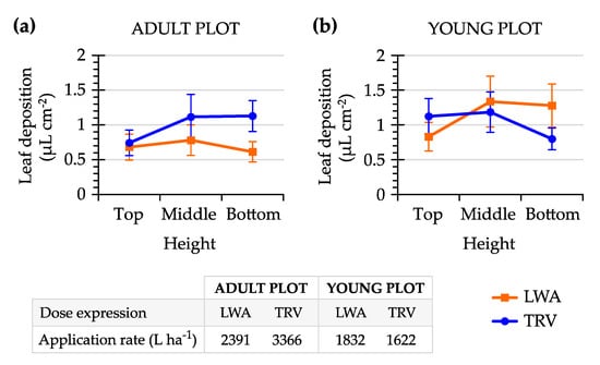 On the other hand, in the young plot, the dose expression was statistically significant in interaction with height (Table 8). The amount of leaf deposition on the canopy bottom was significantly greater with LWA than with TRV, while in the top and the middle heights, the deposition with LWA and TRV was similar (Figure 9).