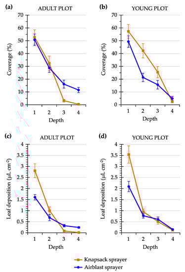 In both plots, the differences in both tree coverage and leaf deposition due to the sprayer depended on factors related to the location in the canopy. As expected, it was observed that in the two plots and with both sprayers, the highest coverage and leaf deposition were reached in the outer canopy, directly facing the spray, and they decreased progressively as the depth increased (Figure A1, Figure A2; Figure 10). Nevertheless, this reduction depended significantly on the sprayer, since the interaction “Sprayer × Depth” for coverage (Table 7) and for leaf deposition (Table 8) was significant in both plots. In the adult plot, for the depths closest to the sprayer, the air-blast sprayer achieved a coverage similar to that of the knapsack sprayer, but a lower leaf deposition. However, the air-blast sprayer obtained significantly higher coverage and leaf deposition than the knapsack for the depths farthest from the sprayer (D3 and D4), due probably to the air assistance produced by the air-blast sprayer that helps the droplets to be transported further into the vegetation []. In the young plot, the coverage achieved with the knapsack was greater than with the air-blast sprayer at D1, D2, and D3, but these differences disappeared at D4 (Figure 10b). In the case of leaf deposition, the knapsack got greater deposition than the air-blast sprayer only at D1, not finding differences in the rest of depths (Figure 9c,d). In this case, the air of the air-blast sprayer also transported the droplets further, and lower coverage and leaf deposition were found close to the sprayer.