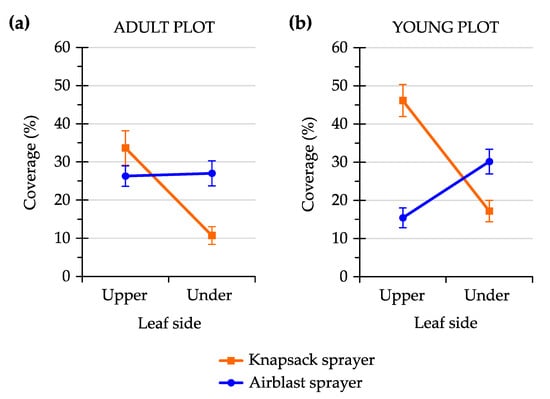 The overall mean coverage per tree and mean leaf deposition obtained in each plot with each sprayer and dose expression, as well as the mean deposition normalized with the sprayed amount applied (μL cm−2 per g of BSF ha−1), are shown in Table A1 (Appendix A). It was observed that the normalized deposition for a given sprayer in each plot was approximately the same for both application volume rates (Table A1), thus indicating that the efficiency of each sprayer in each plot size was almost constant in the range of volumes applied. In both plots, the knapsack sprayer showed higher efficiency of deposition than the air-blast sprayer, between 1.3 and 1.5 times higher, regardless of the size of the canopy. Moreover, the deposition efficiency in the young plot was between 2.0 and 2.3 times higher than in the adult one, regardless of the sprayer. However, the distribution of the spray volume in the canopy is more important for the biological efficacy of a pesticide application than the mean value of coverage and leaf deposition on the tree; therefore, the statistical analyses were performed taking this into account.