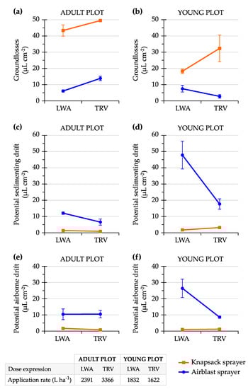 Off-target losses (mean (s.e.), µL cm−2) with the knapsack and the air-blast sprayer in the young plot and with dose expression using (a) LWA and (b) TRV.