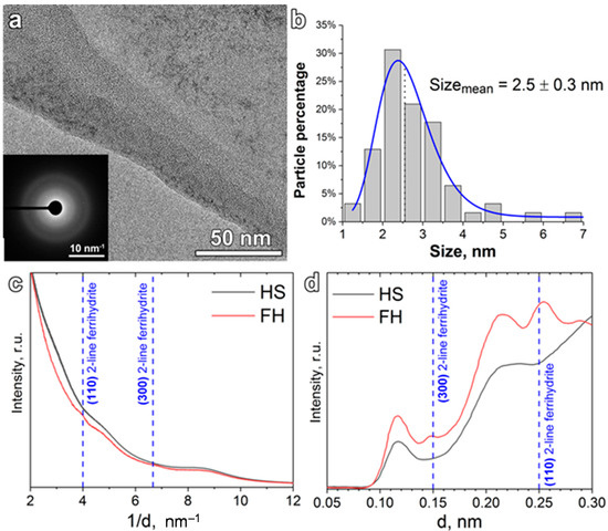 (a) TEM image of the synthesized ferrihydrite (FH) nanoparticles and the corresponding electron diffraction image (inset); (b) size distribution of nanoparticles in FH nanoparticles as revealed by TEM (log-normal fitting was used); (c) normalized electron diffraction integrals for the FH nanofertilizer and raw potassium humate (HS) (d is an interplane lattice spacing); (d) normalized background-subtracted electron diffraction of FH nanoparticles and raw potassium humate, replotted in d-space. Positions of the 2-line ferrihydrite reflections and lattice indexes assignments are given according to [60].
