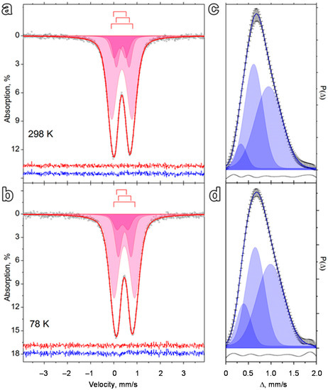 The Mössbauer spectra of the dried FH sample were characterized by an asymmetric shape and broadened doublet lines at both room temperature and the boiling point of liquid N2 (Figure 2a,b). From a non-model description of these spectra, we obtained the probability distribution functions for isomeric shifts and quadrupole splitting (Figure 2c,d). These distributions were characterized by an asymmetric monomodal shape and high dispersion. Both spectra could be satisfactorily fitted with a set of three modes of different width and intensity (Figure 2c,d). This provided the justification for model fitting of the experimental spectra with a set of only three dublet subspectra (Figure 2a,b; Table 1).