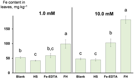 Iron content in the wheat leaves after foliar application of the iron-sources: ferrihydrite (FH) and ferric ammonium salt of ethylenediaminetetraacetic acid (Fe-EDTA), and control solutions: triple-distilled water (blank) and potassium humate (HS). The iron concentrations in the fertilizer sprays were 1.0 mM (left panel) and 10.0 mM (right panel). All treatments, except for the blank, contained urea adjuvant (0.2% wt.). The bars represent the standard deviation (n = 4). The columns marked with different letters are significantly different at p < 0.05 according to the least significant difference (LSD) test.