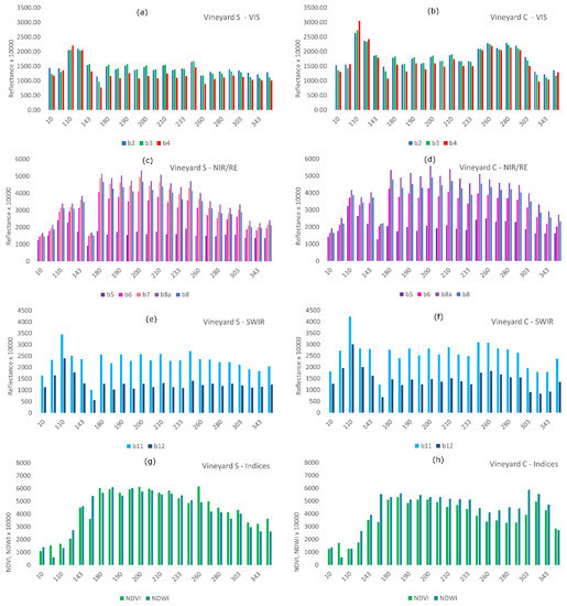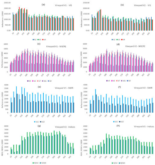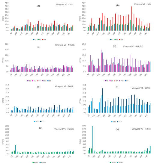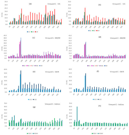 3.2. Temporal Trends of Spatial Variability of Reflectances/Indices within Vineyards