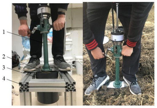 Soil penetration resistance tests in the laboratory and field. Note: 1. Soil penetrometer; 2. Remolded soil samples; 3. Container; 4. Base.