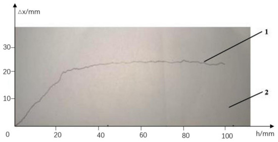 Spring deformation and penetration depth curve (X-axis: penetration depth, in mm; Y-axis: spring deformation, in mm). Note: 1—spring deformation and penetration depth curve, 2—recording tape.